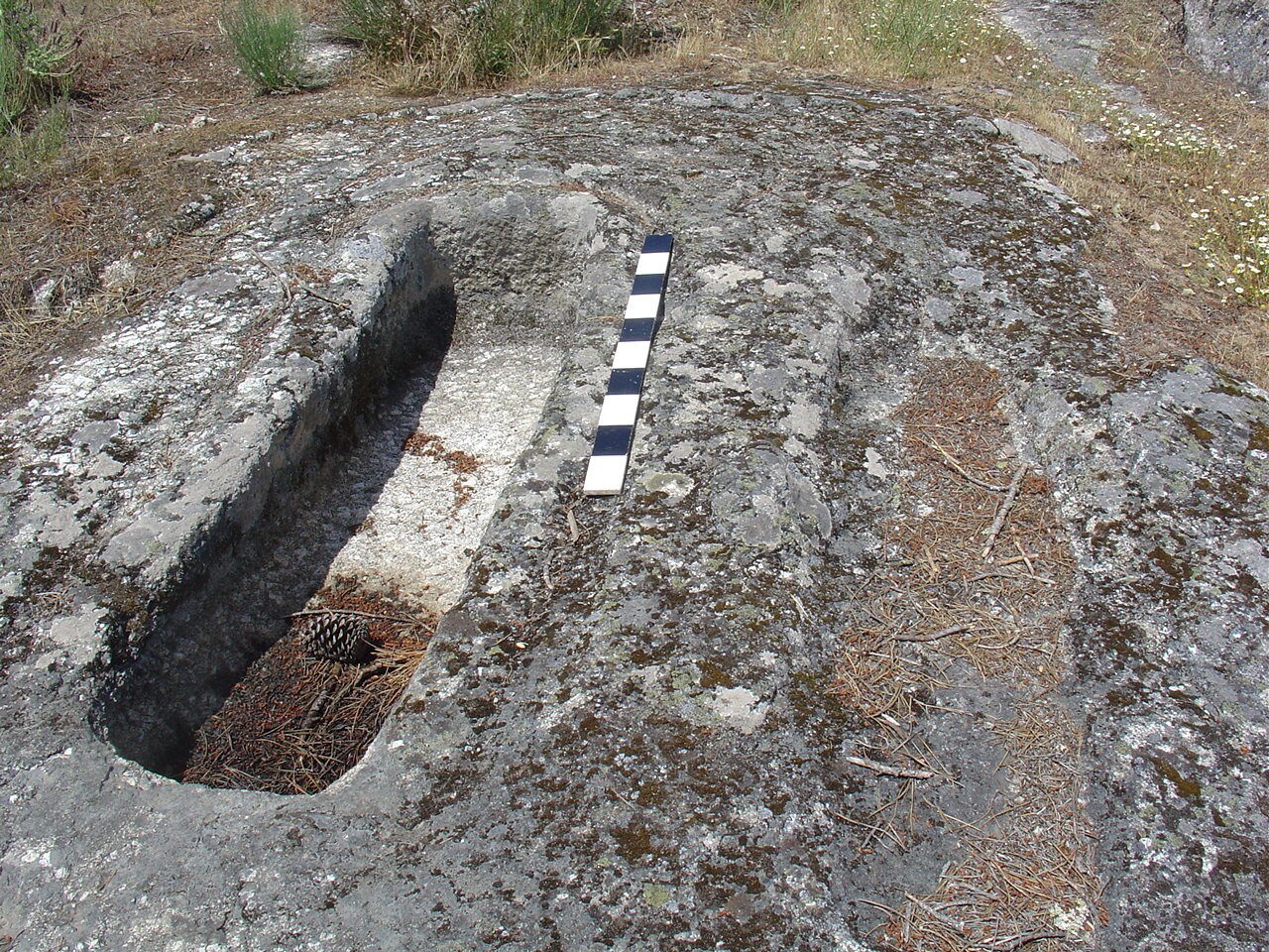 Descrição: Conjunto de 9 sepulturas escavadas na rocha sem contornos antropomórficos sendo 8 orientadas O-E e uma orientada N-S. As mesmas encontram-se em degradação devido ao efeito da água da barragem do Vilar.