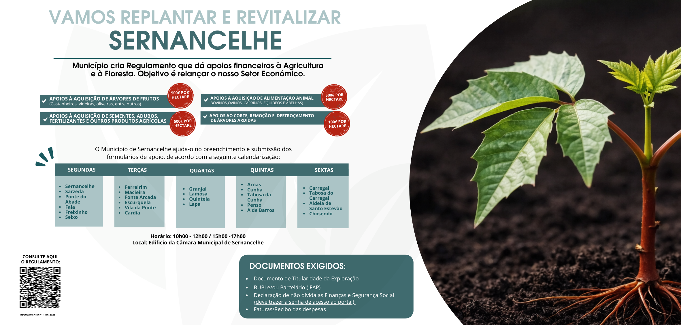 O Município aprovou um Regulamento que assume a missão de ajudar a Replantar e Revitalizar Sernancelhe. Os apoios financeiros destinam-se à agricultura, floresta, empresas e setor social e são a resposta do Concelho ao flagelo dos incêndios florestais de agosto do ano passado.